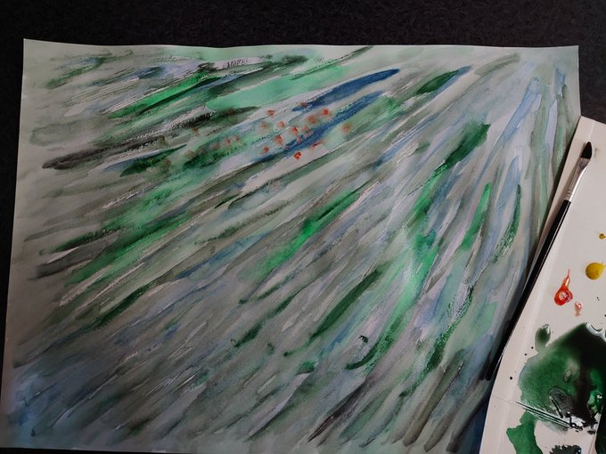 #絵描きさんと繋がりたい #水彩画 乾燥中。 久しぶりに水彩画。白の消耗が激しいので余った絵の具で。最近黒青が好き