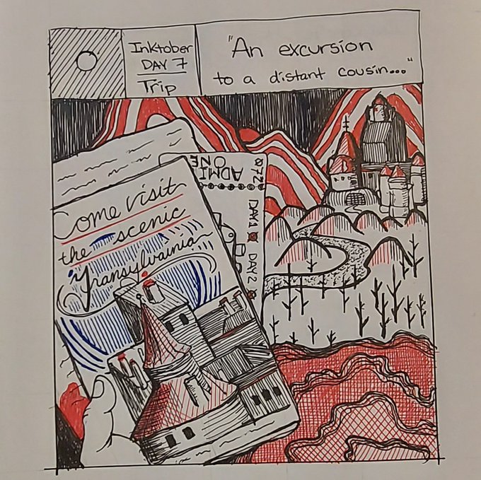 #inktober2022 Day 6: Trip "An excursion to a distant cousin." Growing up with Amish relatives, I always thought that Pennsylvania and Transylvania were like "sibling states". The blood-sucking nature of the Amish is a not related to stories of Vampirism, sadly. #queerartist