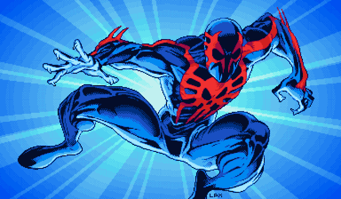 0 6 I finally completed this illustration! I wanted to draw Spider-Man 2099 in a similar style to the victory screens in Marvel Super Heroes. (Original art by Rick Leonardi, from Spider-Man 2099 vol.1 #1) #SpiderMan2099 #pixelart 22/06/08 21:53