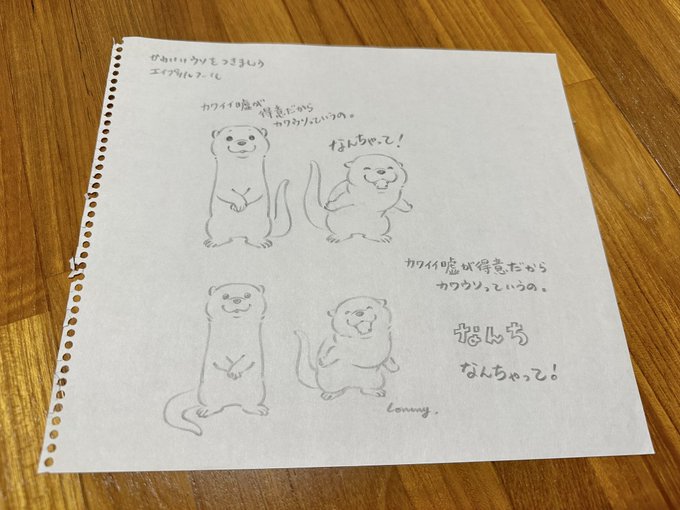 片付けしてたら1番最初に描いた時のラフが出てきた。最初の一回だけはアナログで描いたんだった✏️カワウソの顔が全然違うw #可愛い嘘のカワウソ