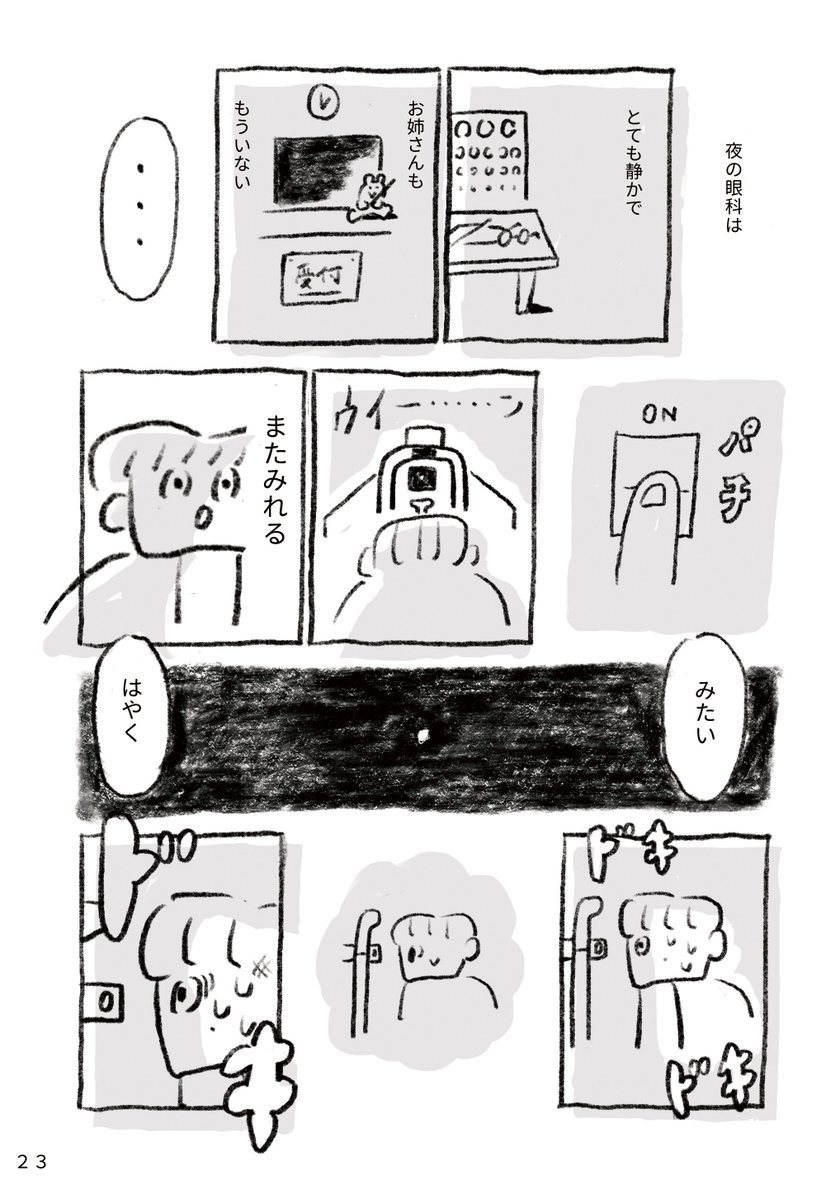 2 6 〓マンガができました〓 『眼科』は眼科検診SF。眼圧検査器から見える「気球の世界」に行きたい少年の20年後を描きました。少年が20年ぶりに見た世界とはーーー? こちらも収録のマンガ『バターになった兄』は@ondo_gallery 『COMIX FEST.』にて販売しています!2/19までです👓 23/02/18 09:58