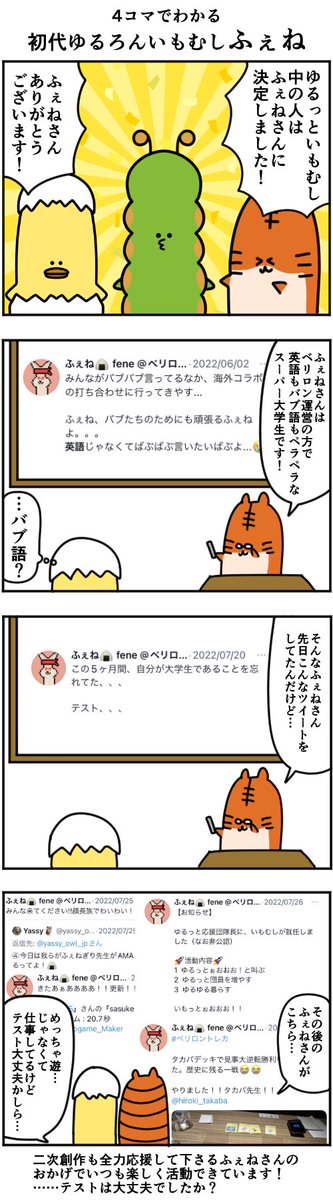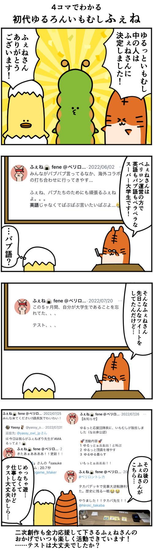 ゆるろんいもむしさんをお迎えいただいた@HirokiYamanaaka さんの紹介漫画を描きました! ベリロン二次創作を全力で楽しんでくださるふぇねさんに感謝🙏✨ 「4コマでわかる初代ゆるろんいもむし ふぇね」 #VeryLongAnimals 二次創作 #ゆるっとべりーろんぐあにまるず #漫画が読めるハッシュタグ