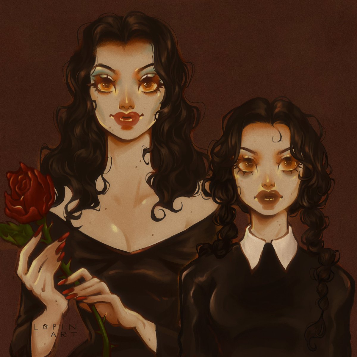 HAPPY HALLOWEEEEN 🎃👻🎉🍭 • Special duo Morticia and Wednesday Addams 🖤💀👏👏for #sixhalloweenfanarts2021 ! Inspired by @karolinepietrowski on insta ✨🤎 #sixfanarts #sixfanartschallenge #theaddamsfamily #halloween2021 #Halloween #wednesdayaddams #morticiaaddams