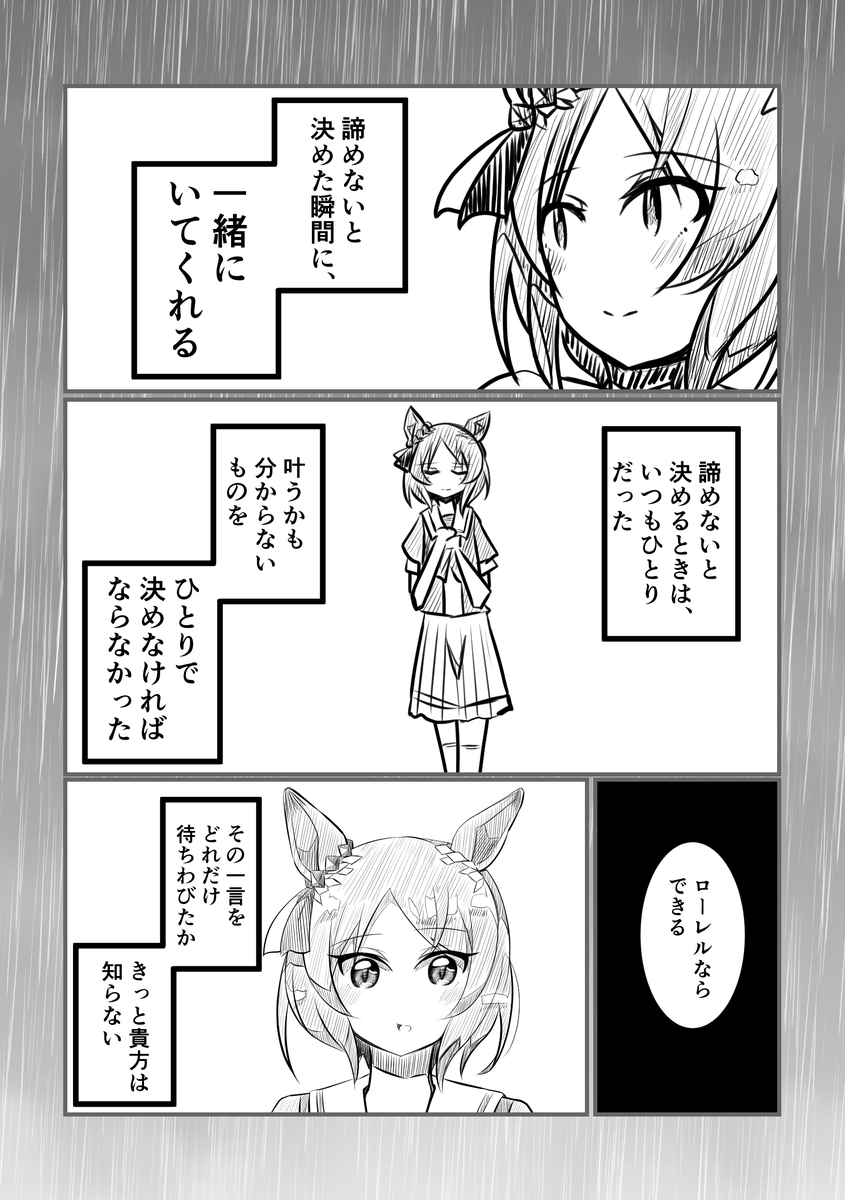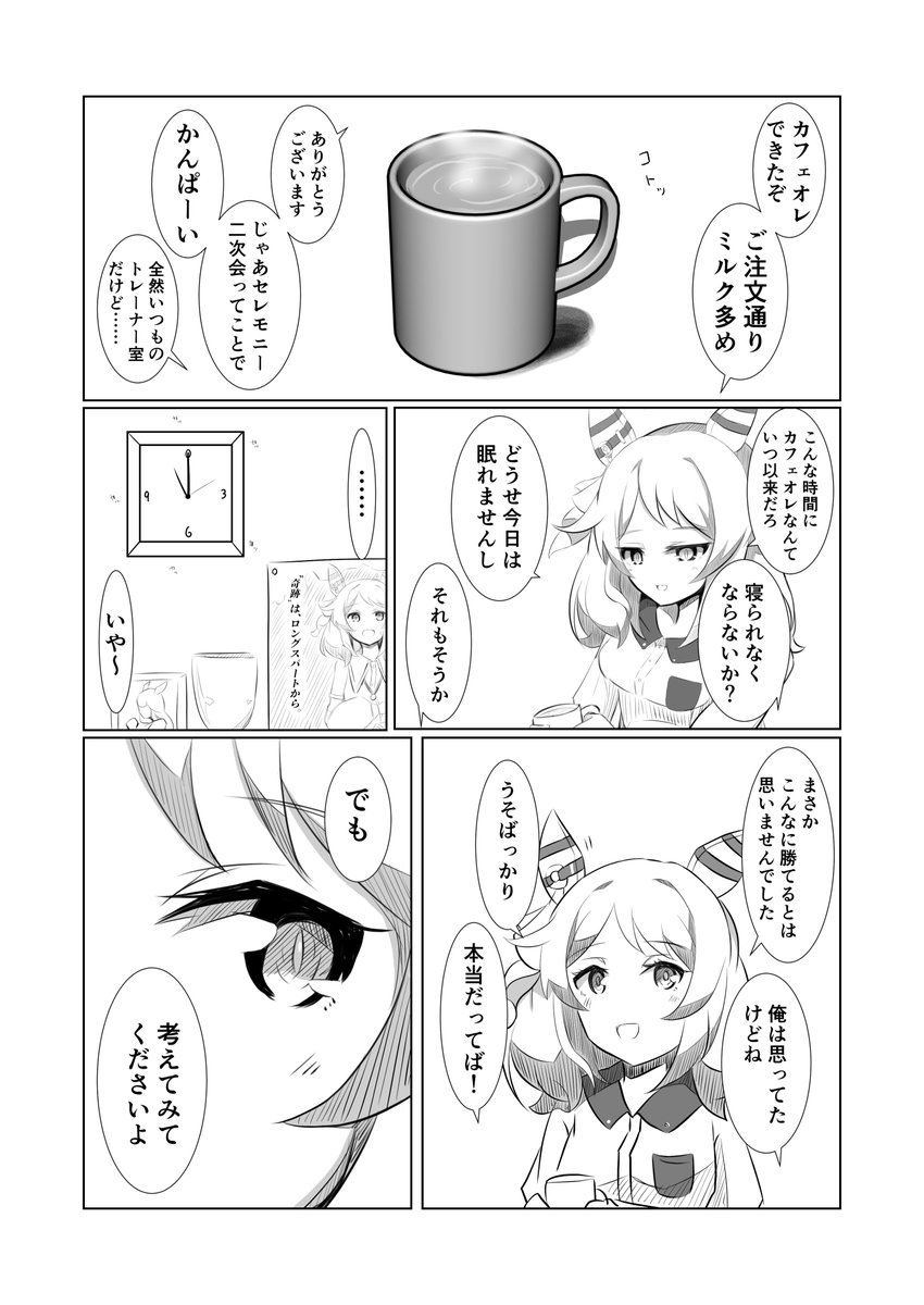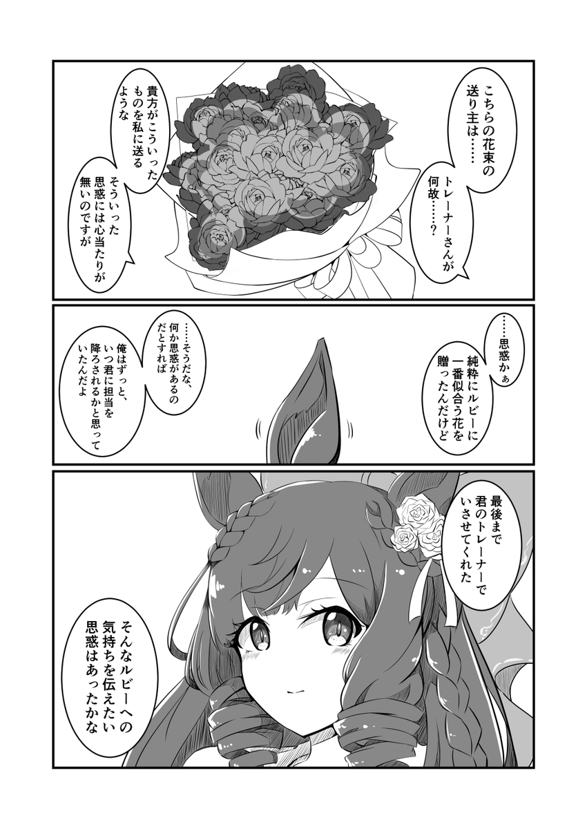 シニア期後バレンタインに、去年よりもいいモノを!と奮発して高級なチョコレートを買ってルビーに渡したら「……去年のものとは違うのですね」と3年一緒にいたトレーナーレベルでないと分からない程度にしょぼんとしたルビーを見てしまったと思うと同時に去年けっこう喜んでくれたんだなと思う回ね