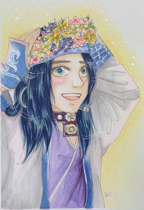 #金カムアナログイラスト部 第3回企画テーマ【花とキャラ】 北海道に自生する山野草をアレンジして描きました🌸 アシリパさんに花冠をあげたのは…… 近日中に対の絵も描こうと思っています(遅筆ですが!) 今回も素敵なテーマありがとうございました🌸