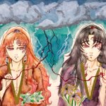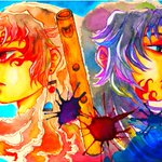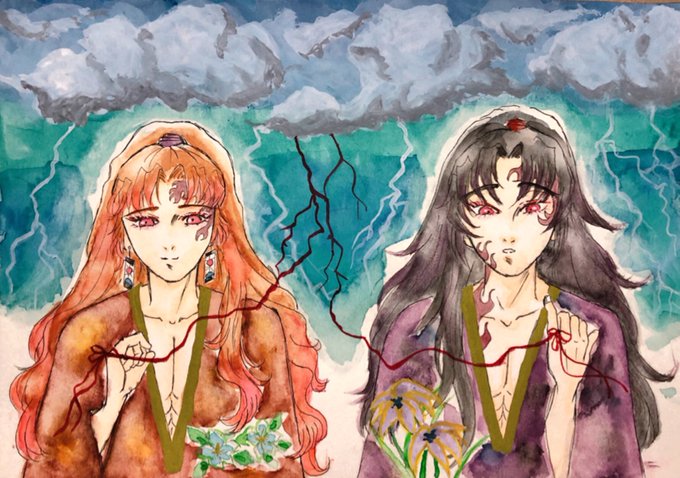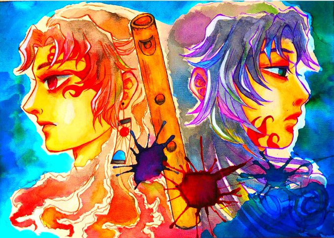 5 27 #縁巌深夜の発表会 お題お借りします 『睫毛』『パートナー』 何を思ったのかよりちと兄上の瞳と髪の色を逆にしてみました 痣はそのまま 『貴方が私 私が貴方 貴方の睫毛が見えるより近い存在 貴方と私は二人でひとつ』 #アナログ #水彩画 21/08/08 23:15