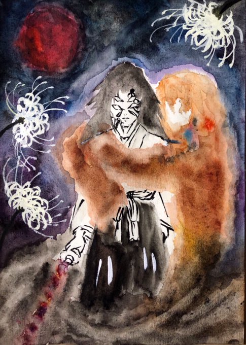 自分が大好きな沙村i弘明先生の無限のi住人のコミックカバーをアレンジしてみちかつ兄上を描いてみました… これ誰状態だし沙i村先生のテイスト全然出てないよ😭 でも投下する…自分のスキルアップのために✨!! #アナログ #水彩画 #模写アレンジ