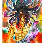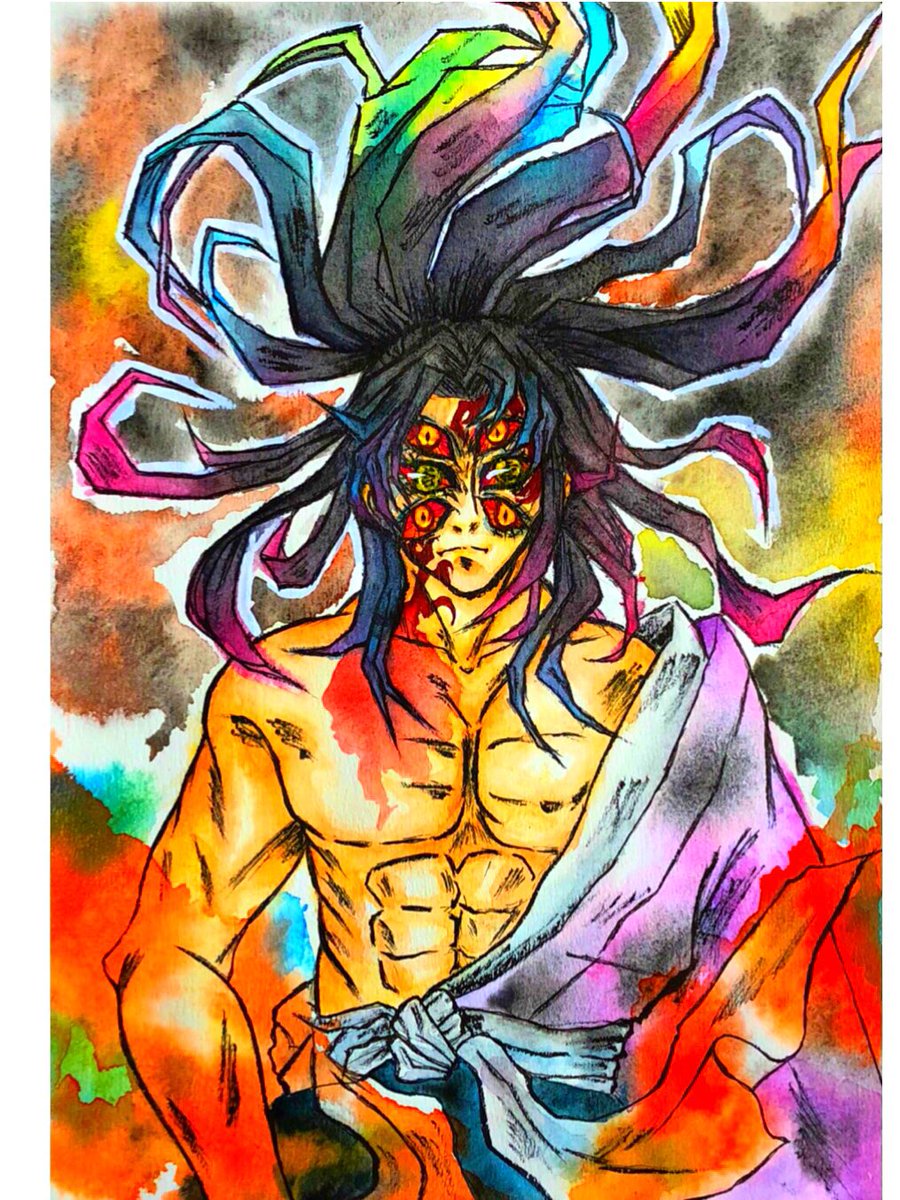 6 24 アートセラピー1作目という事で心のおもむくままに描いて色を塗りました 『苦悶』 リアルでも色々と自分の心と葛藤して苦悶してました #鬼滅の刃 #ファンアート #継国巌勝 #アナログ #水彩画 #カラー筆ペン 21/08/15 19:13