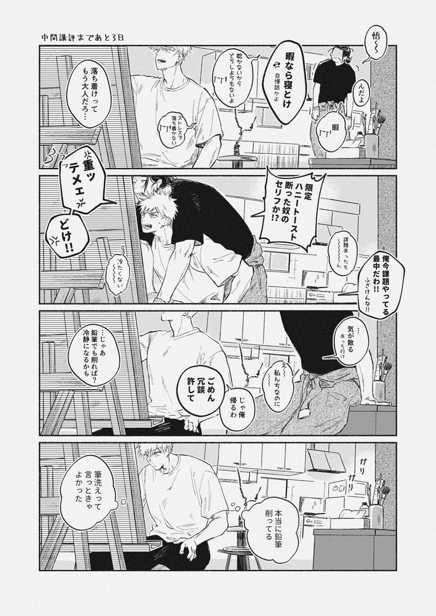 【委託販売告知③】 『The Time We Made』B5/60P 日本語版はとらのあなにて予約受付中 ecs.toranoana.jp/joshi/ec/item/… 夏五美大パロ二冊目、時系列的には0巻。 浪人生傑が美大一年の悟と出会うから~二年目の梅雨時期まで、4つの話を収録。 最低限の設定情報有り、前作未読でも大丈夫なはず。 (1/3)