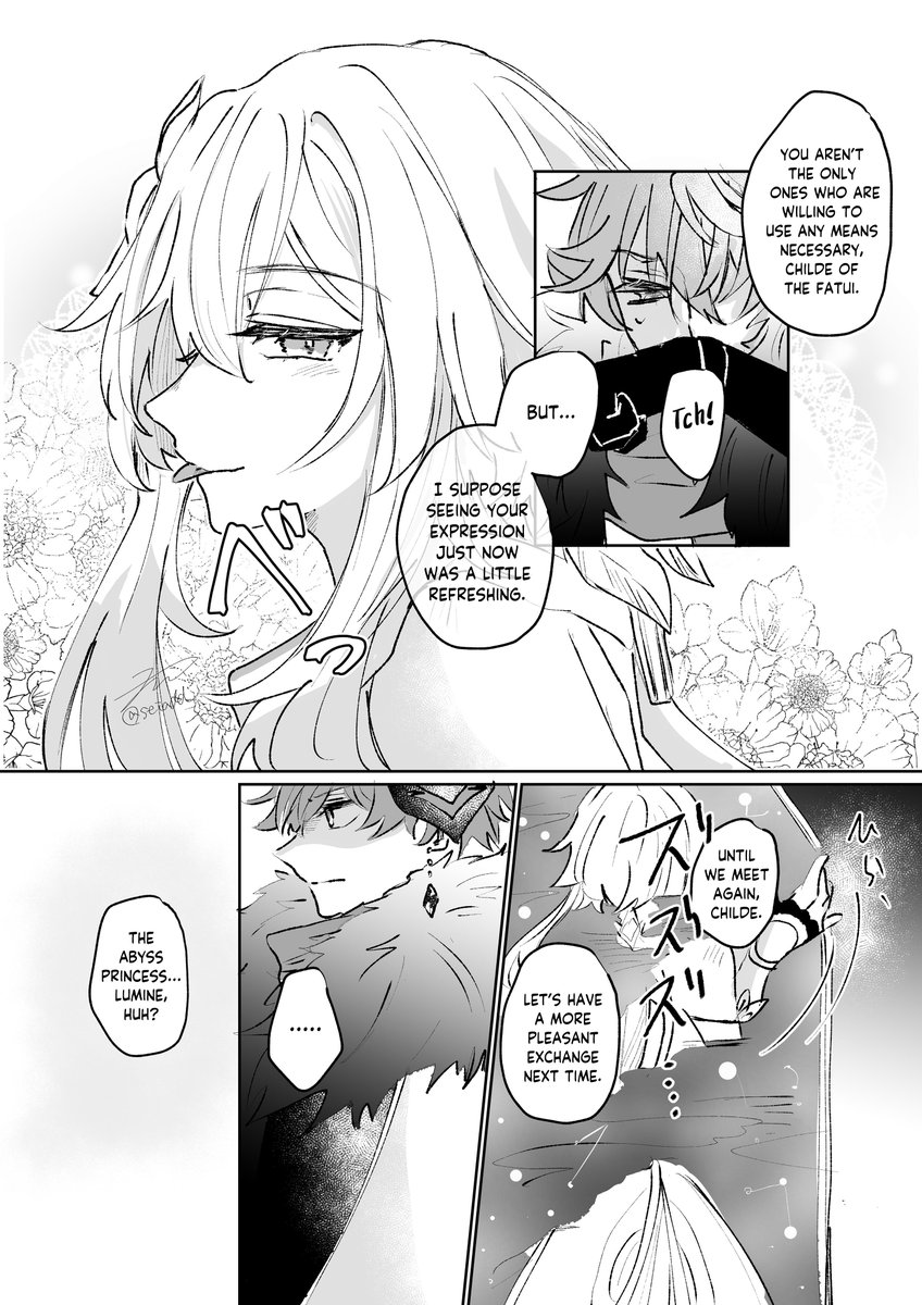 「the abyss princess and the fatui noble」- part II the english translation for the second part of the scenario between childe and abyss princess lumine 💕 not a sequel, but takes place in the same universe! thank you again to @seiaddさん for the wonderful manga! #chilumi #タル蛍 twitter.com/seiadd/status/…