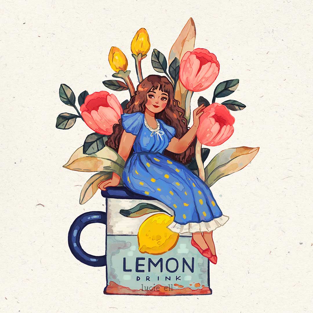 A fairy sized lady on a normal sized cup or a giant cup with giant flowers? I'll let you decide!