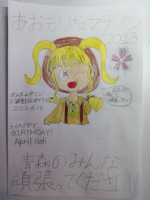 皆さん、少し早いですが明日はポムポムプリンの誕生日です❗ それと同時にあおもり桜マラソン🌸が明日からスタートです❗❗ その日が誕生日のポムポムプリンから青森県の皆さんを応援します❗ 青森県の皆さん、絶対に頑張ってください❗ #ポムポムプリン #あおもり桜マラソン2023 #応援イラスト