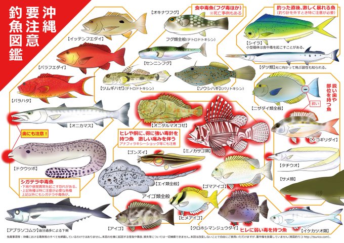 沖縄の釣魚で、毒魚とか注意したほうが良い魚がまとめられている資料が少ないので描いてみた。 条件付きでフリー素材となります。 後ほどサイトにPDF版もUPします。 tsurico.com