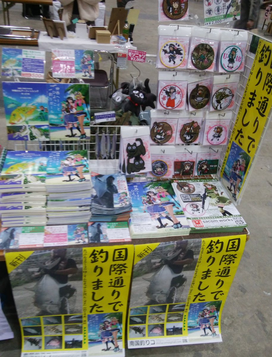 112ページのオリジナル釣り漫画から沖縄釣りのガイド本、オッサンのプロモ冊子、刺繍ワッペンに猫ぬいぐるみにハンドメイドルアーまで!散らかったブースですが2回ワクチンPCR検査もクリアして、沖縄からCOMITIA139へ。魚持ったオッサンが目印の「こ28a」へめんそーりよ~ #COMITIA139 #コミティア