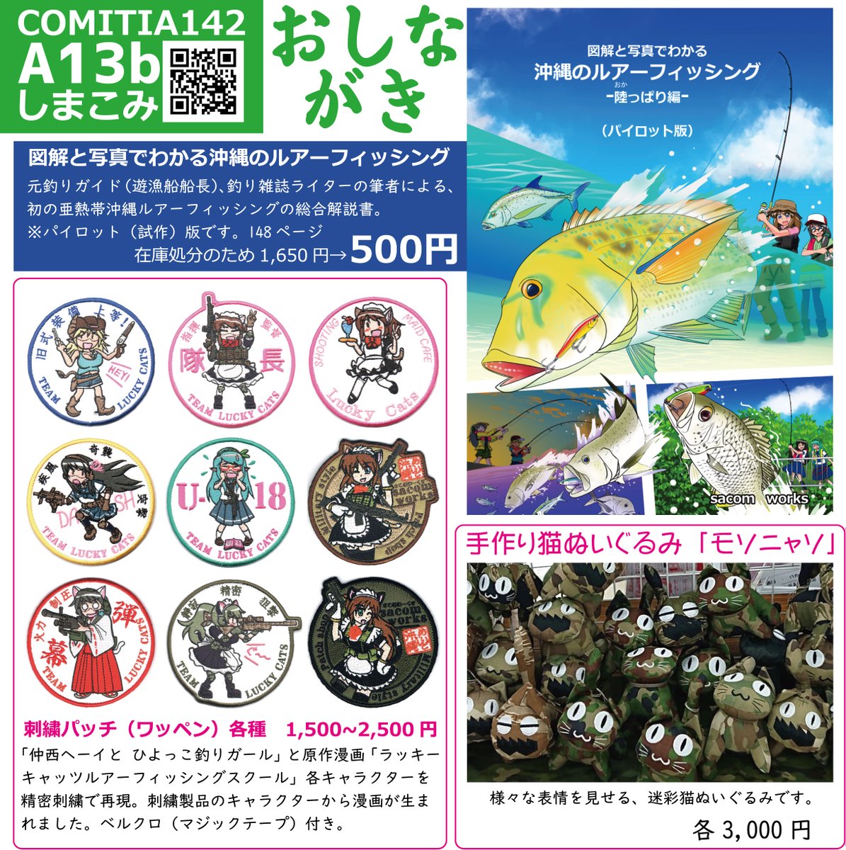 沖縄に戻ってきましたが、また来週も東京出張。コミティア142にブース出させていただきます!A13bです 新刊「仲西ヘーイと ひよっこ釣りガール②」と既刊、オリジナル刺繍ワッペンとか迷彩猫ぬいぐるみとか、誰得なフルカラー無料パンフレットとかいろいろ持っていきます! #コミティア142 #COMITIA142