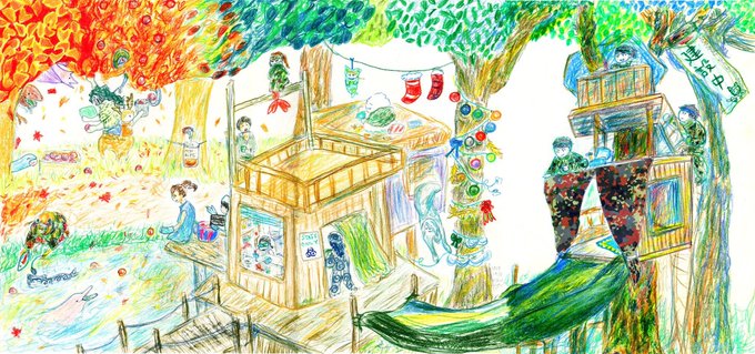 たぶんこれ 元の絵が3枚あって繋ぎ合わせるとこうなるというやつです #今までで作画カロリーMAXの作品上げようぜ