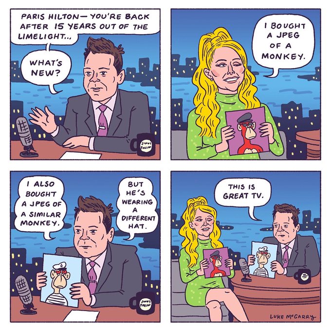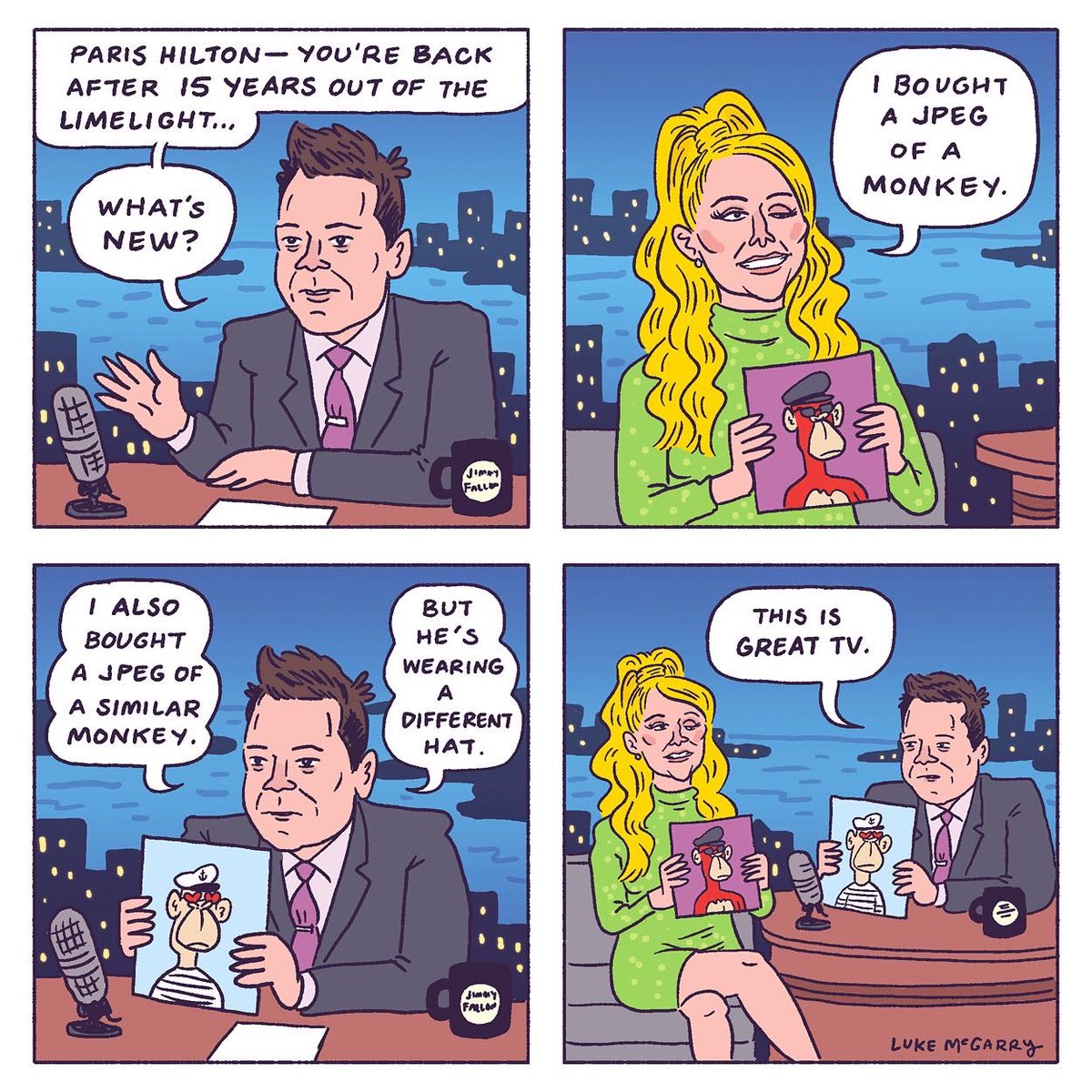 I did a comic about @jimmyfallon and @ParisHilton making tv magic discussing monkey jpegs on tv. #NFT #allmyapesgone