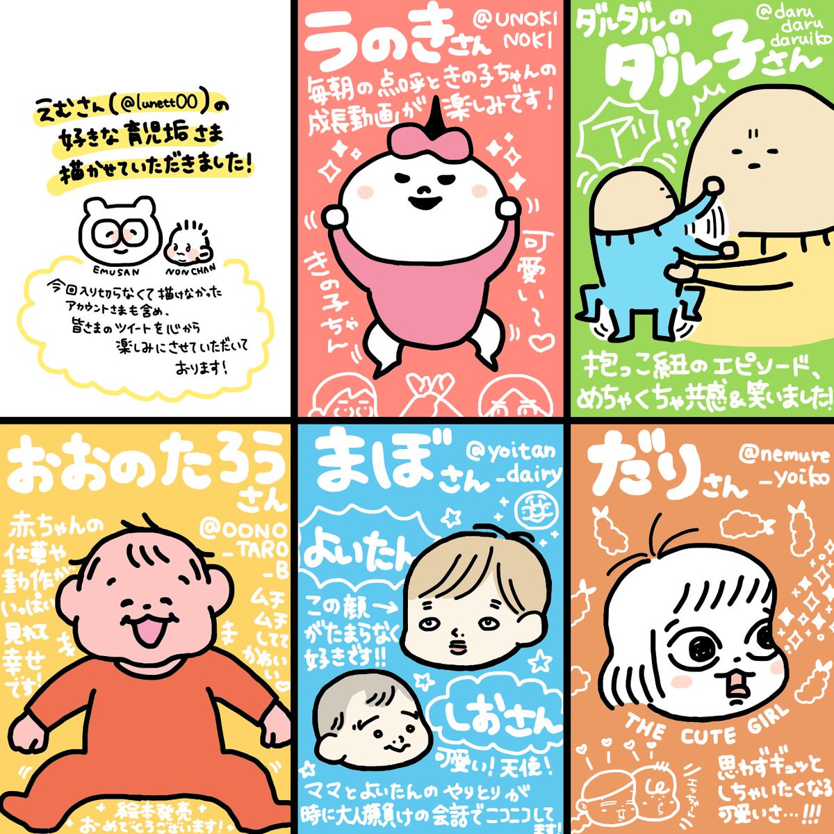 26 243 いつもこっそり拝見してはニヨニヨさせて頂いてるアカウントさまを描かせて頂きました🥰 うのきさん(@UNOKINOKI ) ダルダルのダル子さん(@darudarudaruiko ) おおのたろうさん(@OONO_TARO_B ) まぼさん(@yoitan_diary ) だりさん(@nemure_yoiko ) これからも更新楽しみにしてます!💕 22/04/19 09:16