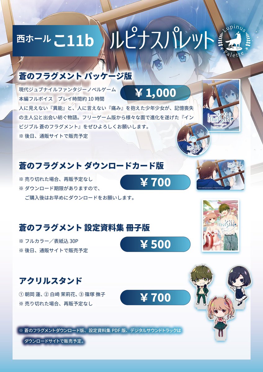 あなたのサークル「ルピナスパレット」は、コミックマーケット100で「土曜日西地区 "こ " 11b」に配置されました!コミケWebカタログにてサークル情報ページ公開中です! webcatalog.circle.ms/Circle/1620379… #C100WebCatalog 蒼のフラグメントの一般頒布開始はコミケ100になります🍧 よろしくお願いします!
