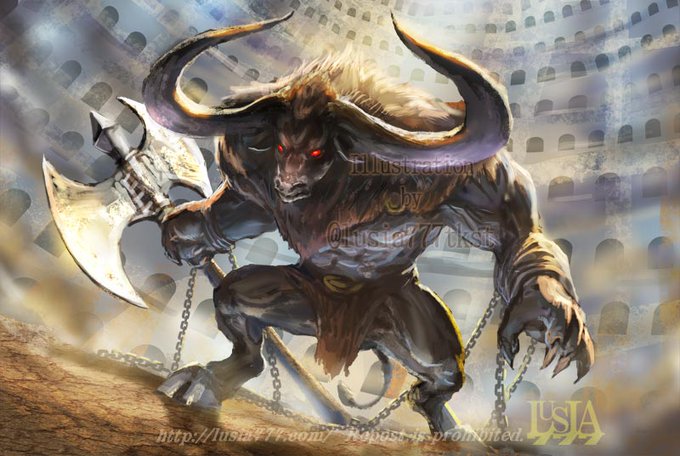 079/ミノタウロス ギリシャ神話に登場する牛の頭を持つ怪物。 ポセイドンの怒りをかって呪いを受けたミノス王の妻と白い雄牛の間に生まれた。 成長したミノタウロスは手に負えないほどの乱暴者になったため、ダイダロスが作った迷宮に閉じ込められる。 #lusia777_artworks #モンスター