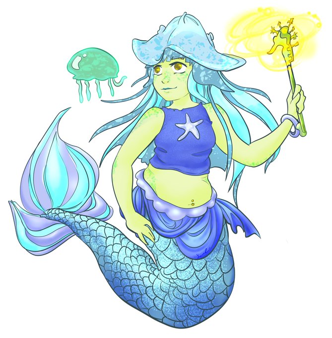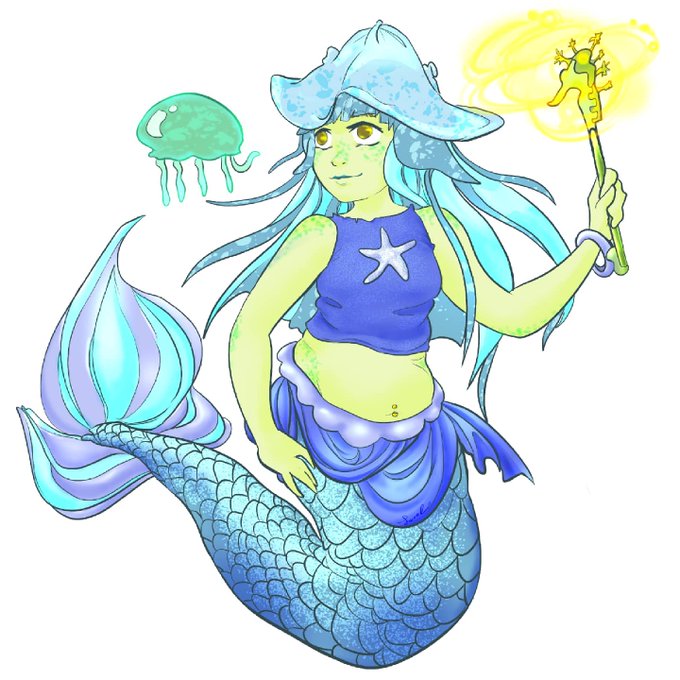 Here's a mermaid based on a stingray hat that I saw in the Florida aquarium. 😍 I knew immediately that they needed it as a witch hat and a seahorse wand, to pair with it. ✨ #digitalart #mermay #mermay2021 #ArtistOnTwitter