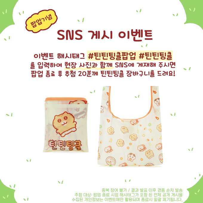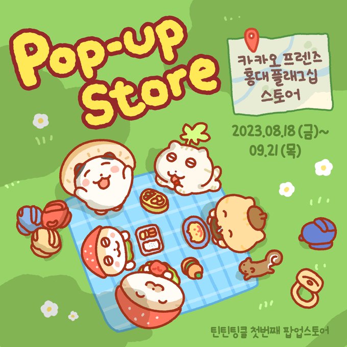 Pop-Up store 🐥틴틴팅클의 소풍 🐥 틴틴팅클과 함께 소풍을 떠나요🐾 🌷장소: 카카오프렌즈 홍대플래그십 스토어 (홍대입구 8번 출구 앞) 🌷일정: 2023.08.18(금)~0.9.21(목) 🌷이벤트🌷 구매 금액 별 선물 증정 이벤트와 SNS 태그 이벤트를 준비하였습니다! 많은 관심 부탁드려요💓 🍃구매… twitter.com/i/web/status/1…