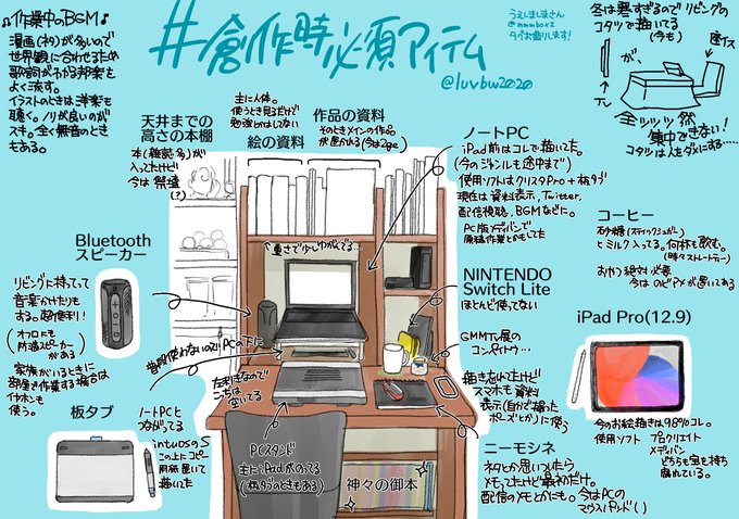 私の作業環境に興味ある人なんているか…?と思ったけどみなさんの見てたらめちゃくちゃ面白かったのでもしかしたら地球上でひとりくらいは面白がってくれるかもしれないし私が描くの楽しいからいいやと思って超今更描きました!…が、背景とか道具描けないんだった…Ouch… #創作時必須アイテム
