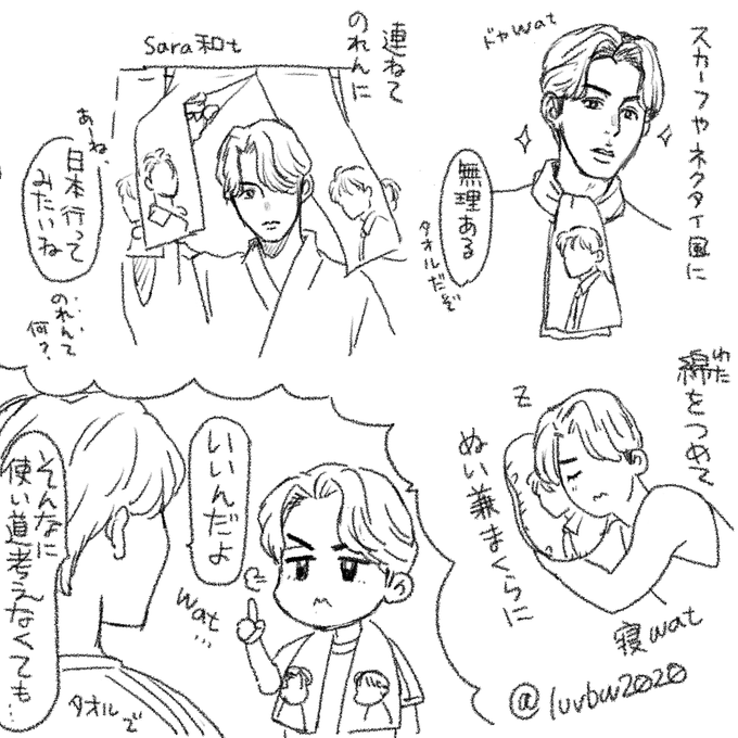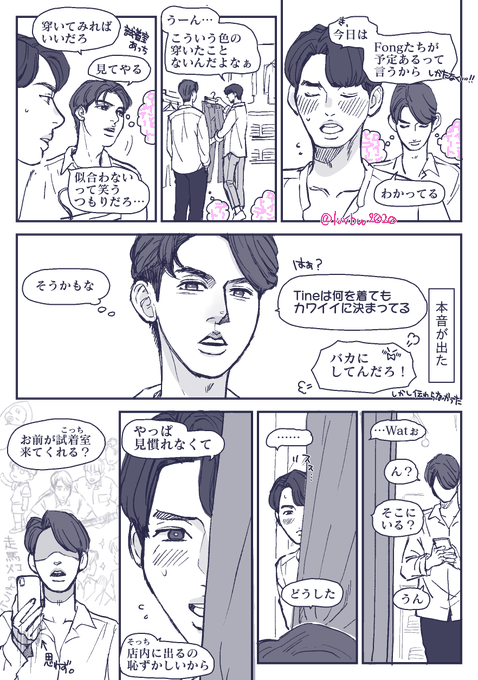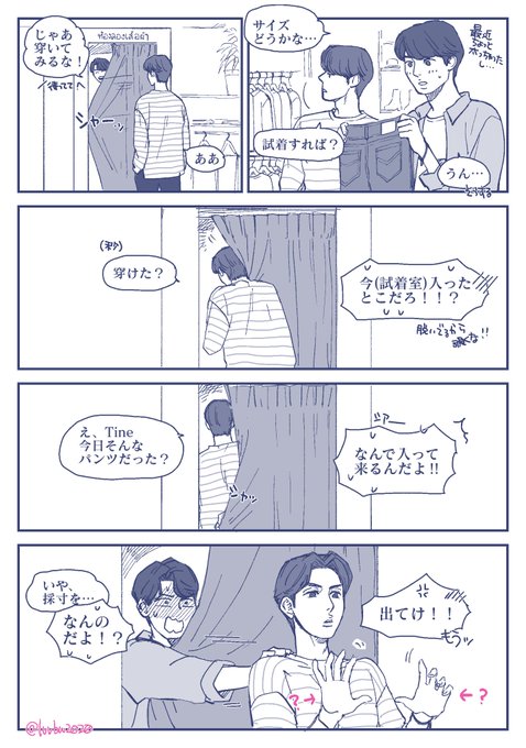 試着室ネタ、前回はStill時期のものを描きましたが天才(なかたさんありがとうございます!)から頂いたリプで「無印本編のサラタイVer.」も描いてみたくなったので描きました。Sarawatが告白する(EP7)より前のお話。なぜか一緒に服を買いに行くことになったサラタイ。 #SarawatTine創作 #サラタイ twitter.com/luvbw2020/stat…