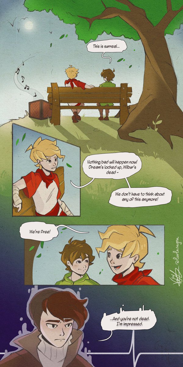 I wanted to capture one of the rare moments of tranquility in this godforsaken storyline x) Click to see the full page! Very proud of this one #tommyinnitfanart #tubbofanart #dreamsmpart #wilbursootfanart #digitalart