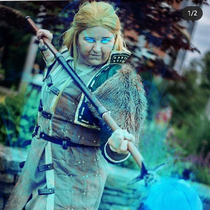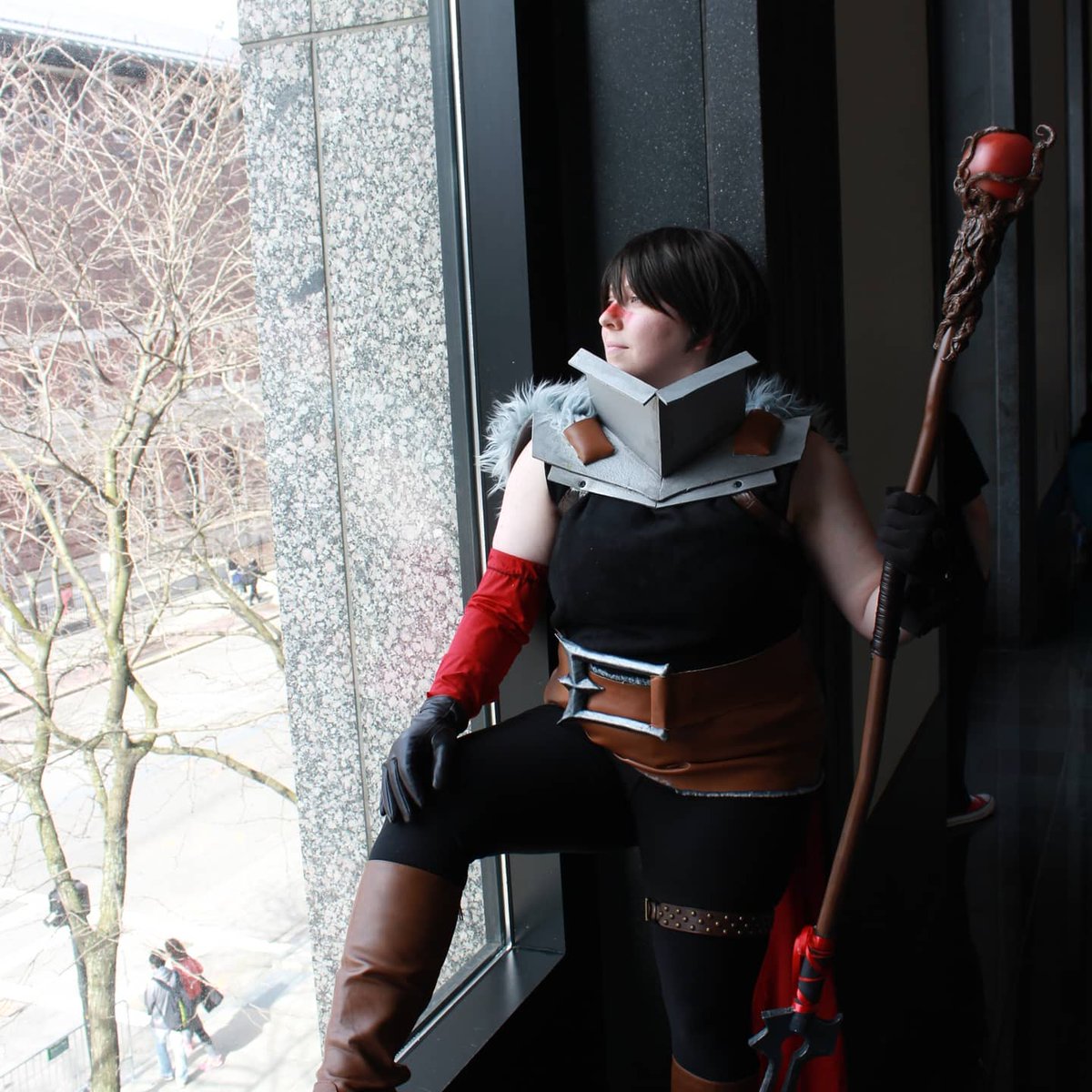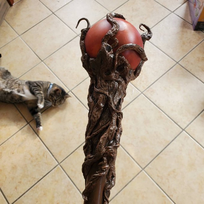 Day 17 of #shepropchallenge: first time working with a material I made my first ever Mage staff using thibra, I was so frustrated with it at first 😫 but this staff came out so well and @jamblute rocks it in her Hawke cosplay! #cosplay #dragonage #staffofparthalan #bioware
