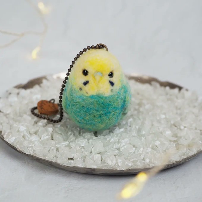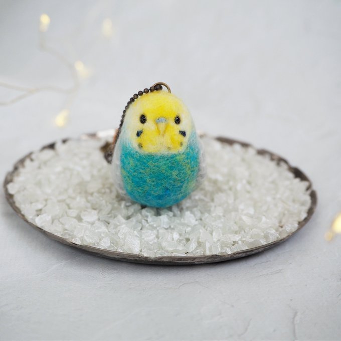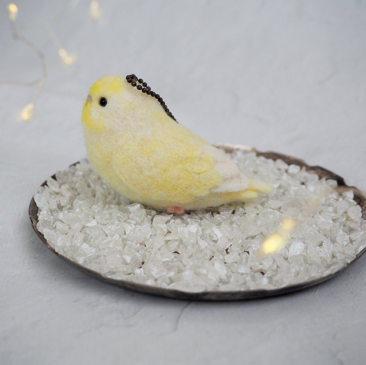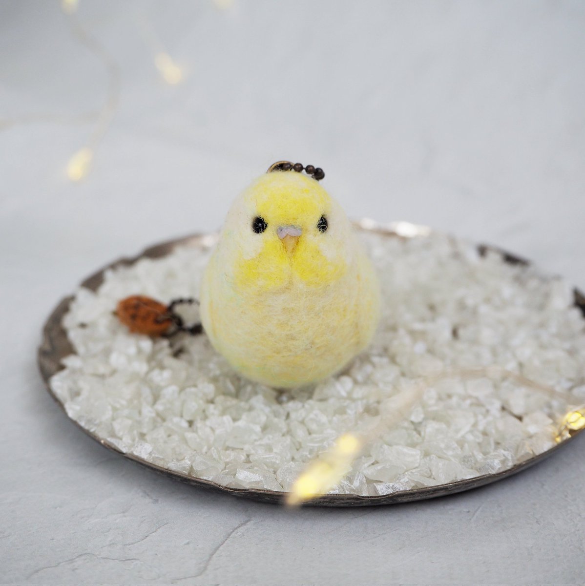 オーダーのセキセイチャームです🐥 3枚目にモデルインコちゃんを載せています💕 優しい淡い黄色に、写真では写らないぐらい薄いブルーが所々に入っています☺️ とても綺麗なインコさんでした! オーダー有り難うございました😊 #羊毛フェルト #セキセイインコ