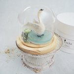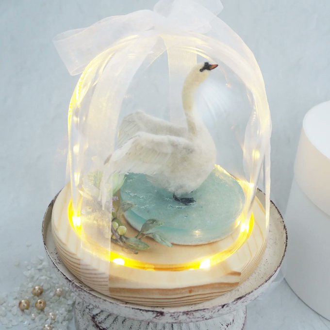 やっっと白鳥作品が完成しましたー! ガラスドームの裏にあるスイッチでライトアップも楽しめます😊 こちらの作品を販売いたします。 詳細はInstagramにあげていますのでよかったらご覧くださいね😊 #羊毛フェルト