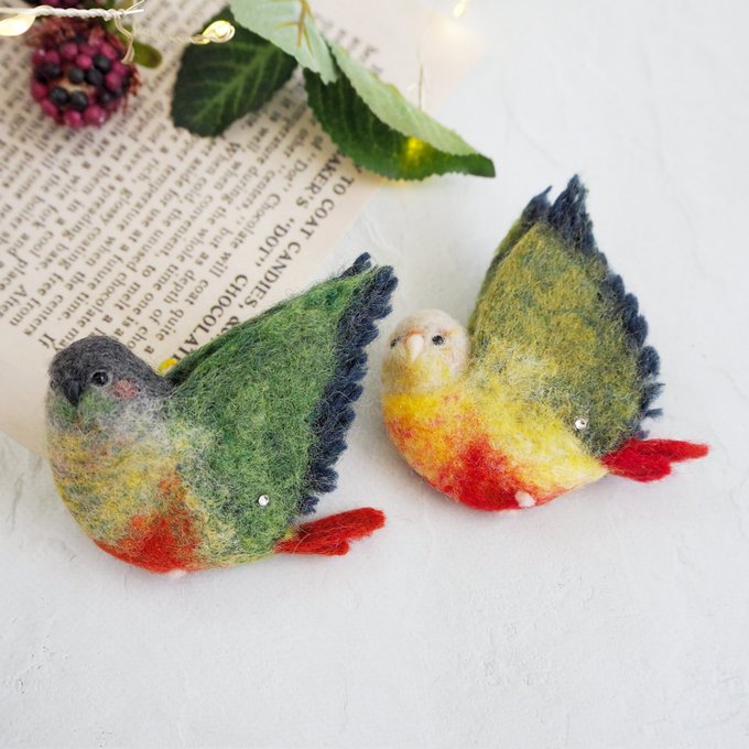 こちらも通販用に制作中の羽ばたきインコブローチ🕊 ウロコインコのパイナップルとワキコガネさんです😁 #羊毛フェルト #ウロコインコ