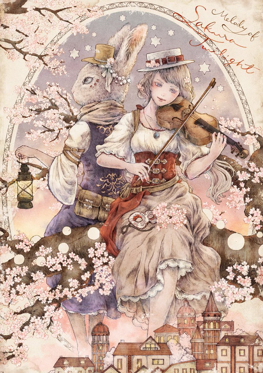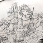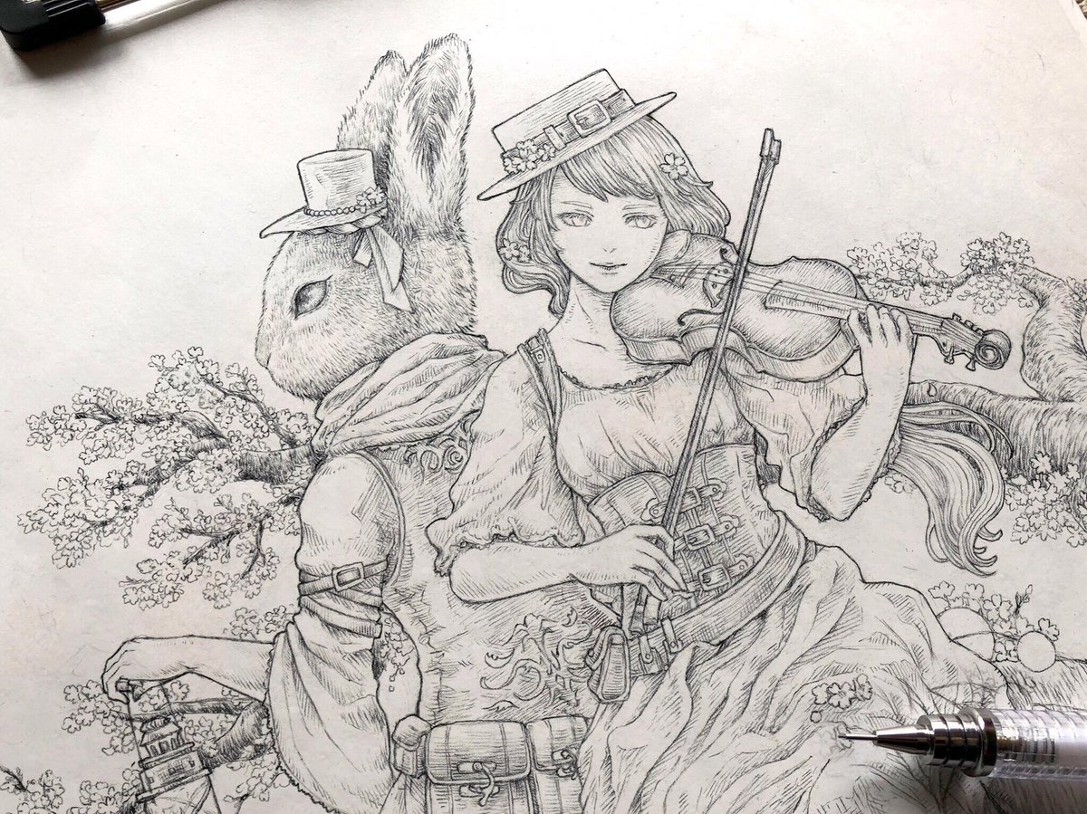 (…以前ちらっとUPしていた創作絵の線画はこんな感じで完成してました🌝 チョイチョイ展示等もあるので、もしどこかで見かけることがあれば宜しく(?)です🐰🎻