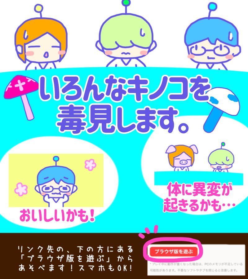 【フリーゲームができました!】 「あやしいキノコ食べてみた。」 freem.ne.jp/win/game/29047 サクッと遊べてスマホからもプレイできるので、ぜひお楽しみください♪ 実況大歓迎! #ゲーム #フリーゲーム #ゆるいイラスト #イラスト #ゲーム制作 #オリジナル #ゲ制 #フリゲ #キノコ #きのこ #SF