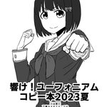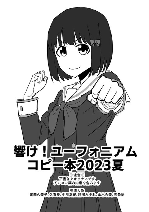 28 76 【告知】コミケ1日目に勇魚さん(@ISANAinUSA)のスペース、東セ37bで売り子をします。 また、同スペースにて響け!ユーフォニアムのコピー本を置かせてもらう予定です(画像は表紙)。A5/10P/0円です。既刊の廣井きくり本も持って行きます。よろしくお願いします。 23/08/09 07:39