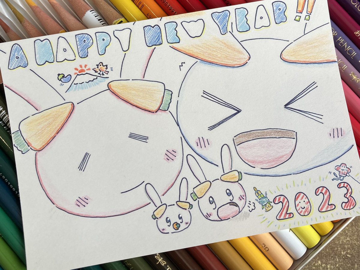 1 0 あけましておめでとうございます🎍 今年は卯年🐇 たくさんイラスト作成楽しむぞ! (次女が生まれた友人野うさぎへの年賀状です☺️ #ぺこらーと 23/01/01 07:20