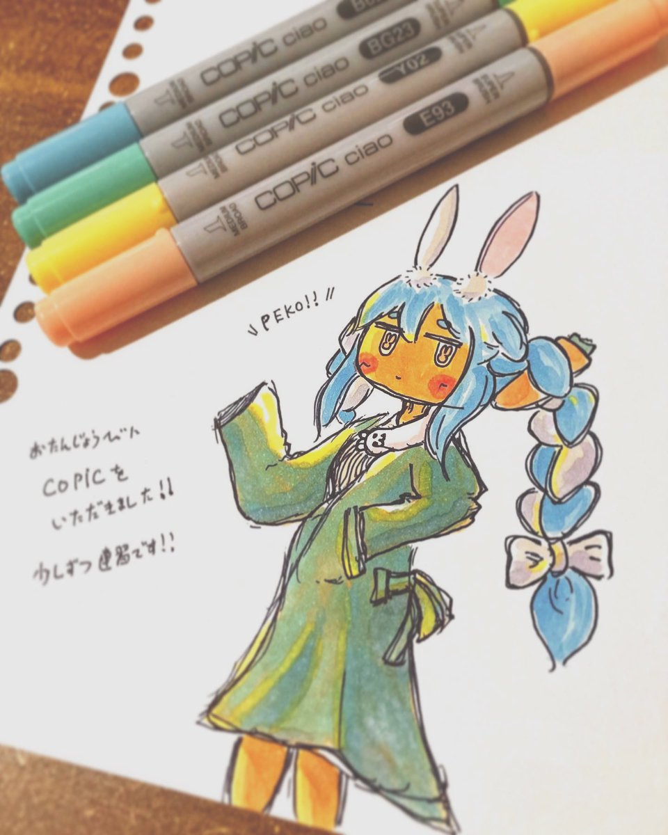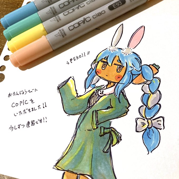 1 0 友人が、誕生日にCOPIC ciaoを電撃プレゼントしてくれたので少しずつ練習するぞ! どんちゃんが瀕死なのは内緒だぞ! #ぺこらーと 23/01/19 23:47