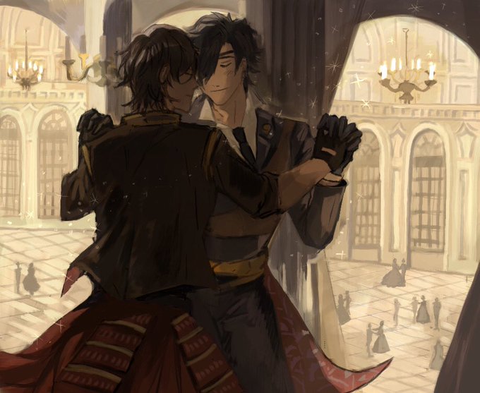 120 511 お城に潜入調査のくりみつ。見事敵を倒してお城に平和が戻って開かれたダンスパーティーをこっそり見ていた二人。光忠がダンスする人々を見て目をキラキラさせるのでそっと光忠の手を取る大倶利伽羅 21/09/18 22:20