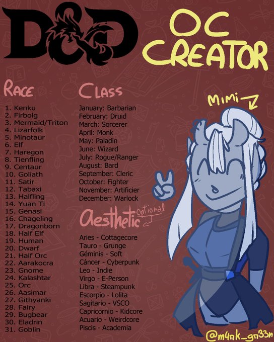 8 26 Create you own D&D OC! QRT with Results ---------------- ¡Crea tu propio OC de D&D! RT mencionando el resultado D&D = Dungeons & Dragons #dndart #dnd5e #DNDRP #dndoc #dndoccreator 22/01/13 00:00