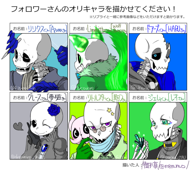 お待たせいたしました!楽しく描かせていただきましたー!(*´ω`*)個性あふれる素敵な子ばかり!デザイン違い、色間違いなどありましたら申し訳ございません… twitter.com/m8m_m_o/status…