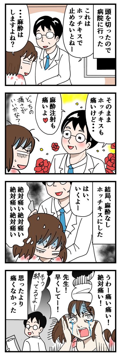 1 6 麻酔なし頭ホッチキスの痛みは? #漫画が読めるハッシュタグ #コミックエッセイ #育児エッセイ #絵描きさんと繫がりたい #4コマ漫画 22/10/11 11:51