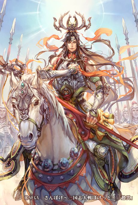 載せるのが遅くなりましたが『さんぽけ~三国志大戦ぽけっと~』にて描かせていただいた「趙雲」です。馬を描くのが楽しかった時期の絵です。アーケード版の画像も一緒に載せておきますね😊 #三国志大戦