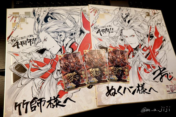 22 43 サンプルカードもいただきました☺️ ちっちゃくてよく見えないのですが、今回僭越ながら背景に孫権様(+砂に埋もれる軍師さん)も描かせていただけまして、とっても嬉しかったです! 21/09/08 18:55