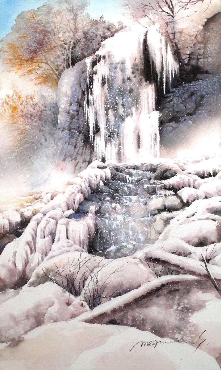 5 88 2022年元旦の乙女滝 部分氷瀑 #透明水彩 #滝 22/02/11 21:11