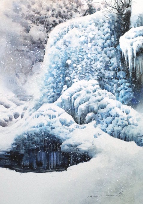 2022年元旦の乙女滝 部分氷瀑 #透明水彩 #滝