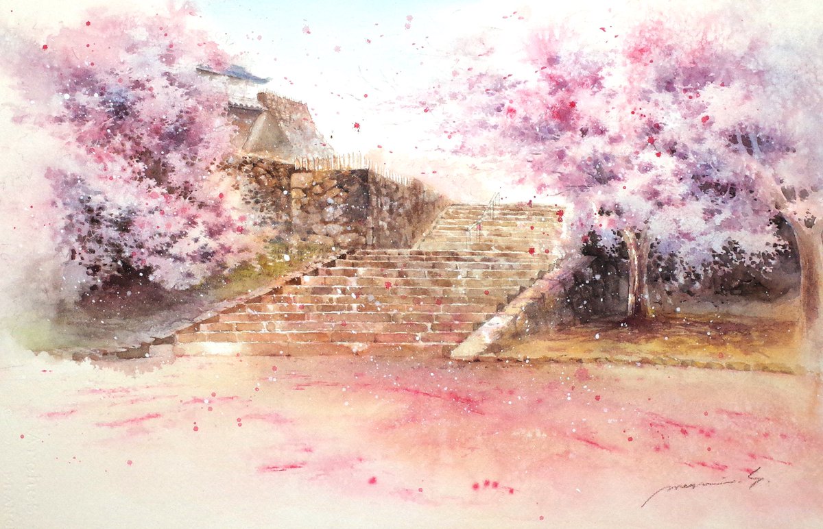 もう梅雨入りの気配が感じられますが、桜の絵をもう少し。 山梨県舞鶴城公園の桜。 #透明水彩 #桜
