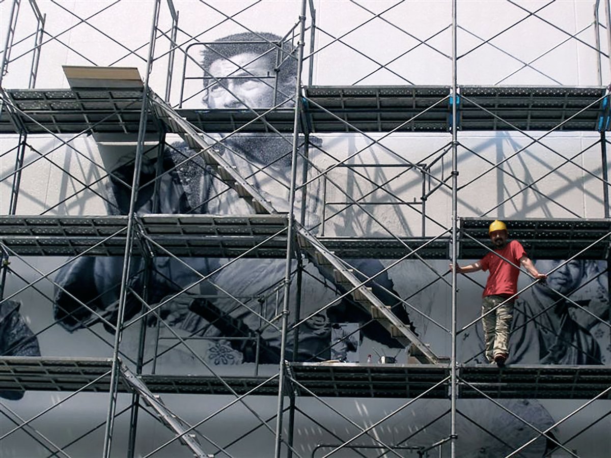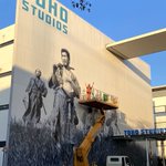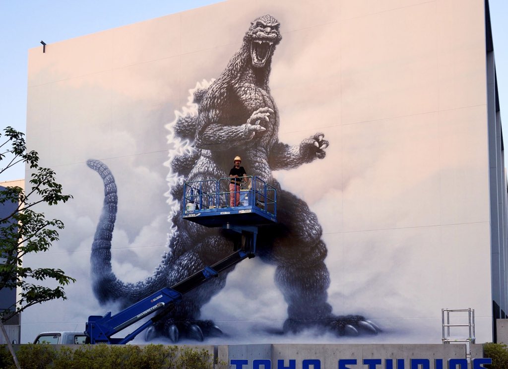 こちらも巨大壁画。高所作業車で描いてます! #ゴジラ #壁画 #東宝スタジオ