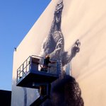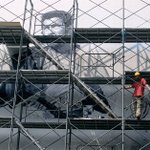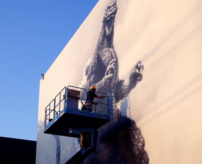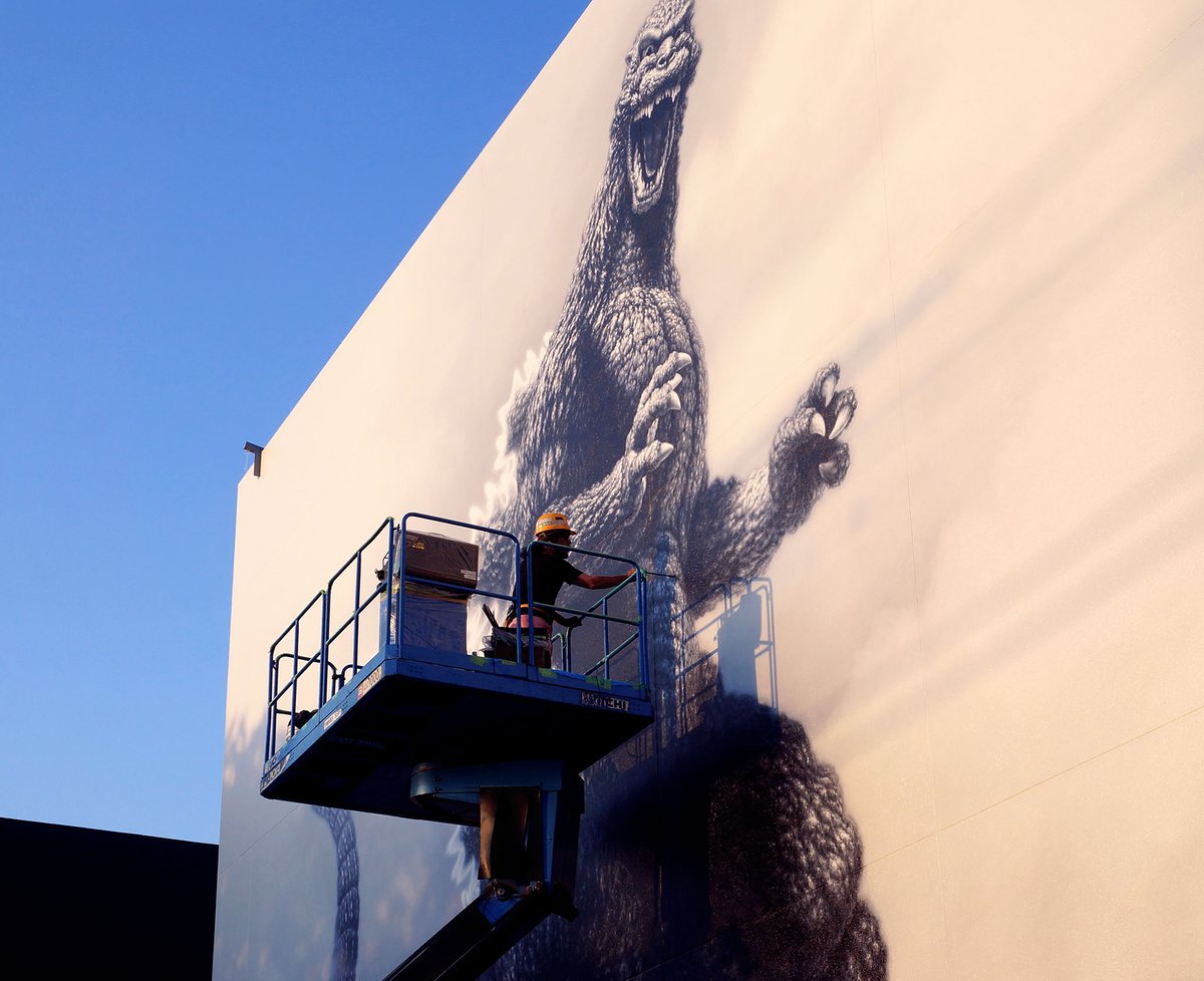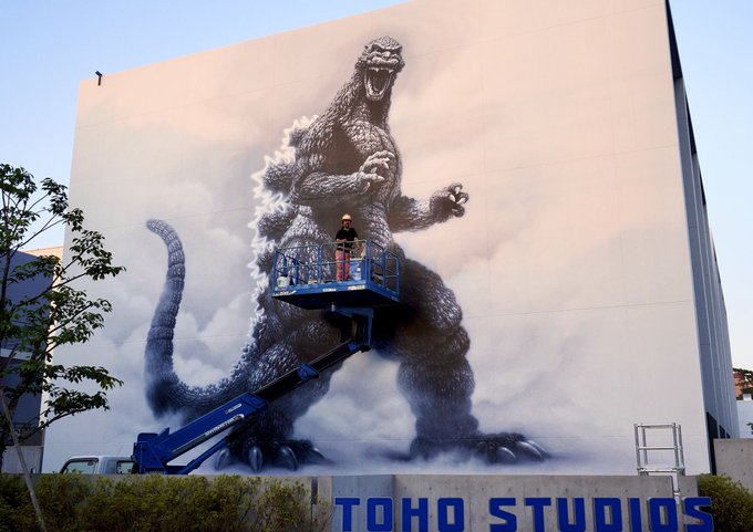 168 378 こちらも巨大壁画。高所作業車で描いてます! #ゴジラ #壁画 #東宝スタジオ 20/07/21 19:45
