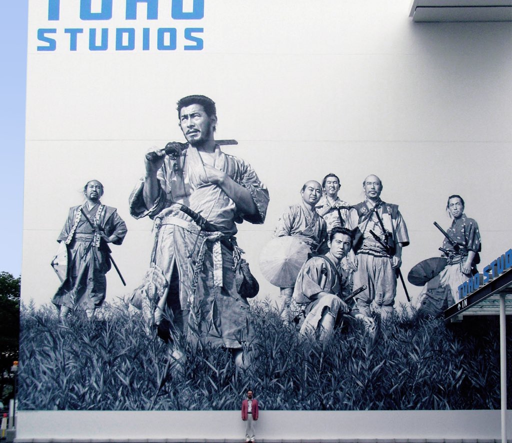 282 747 東宝スタジオ『七人の侍』壁画は2007年に制作しました。全て手描き。 今回、17年の年月を経た塗膜のダメージを補修し、全面をリペイントしました。新たに描き起こしたそれぞれの顔の表情、服の皺、26mに及ぶ草の表現は17年前よりも気に入っています。 ピカピカになった壁画を成城で観てみて下さい。 24/12/16 19:47